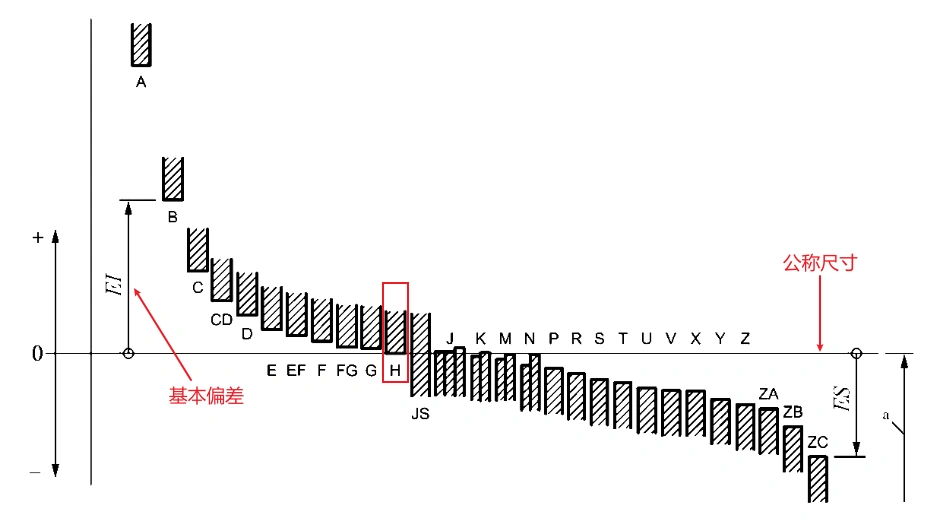 其中,代号A的公差带距离公称尺寸(零线)距离最远,即基本偏差最大,它在零线的上方。代号越往后边公差带越往下掉,到H的时候,下极限偏差为0,即基本偏差为0,再往后,公差带继续往下掉,到ZC掉到最底端: