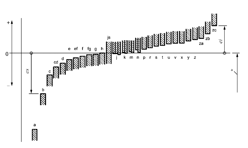 对于轴来说,基本偏差代号用小写字母a, b, ... zb, zc表示;代号为a的公差带距离公称尺寸(零线)最远,且在零线的下方。代号越往后边,公差带越往上升,到代号h的时候,上极限偏差为0,即基本偏差为0,再往后走继续上升,一直到zc;