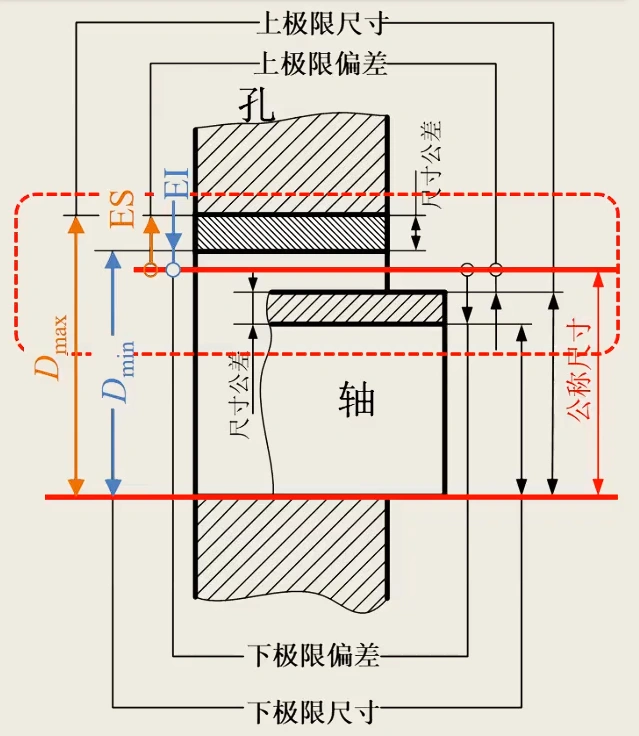 一个尺寸要素所允许的最大尺寸称为上极限尺寸,允许的最小尺寸称为下极限尺寸,孔分别用 Dmax和 Dmin表示、轴分别用 dmax 和 dmin表示;