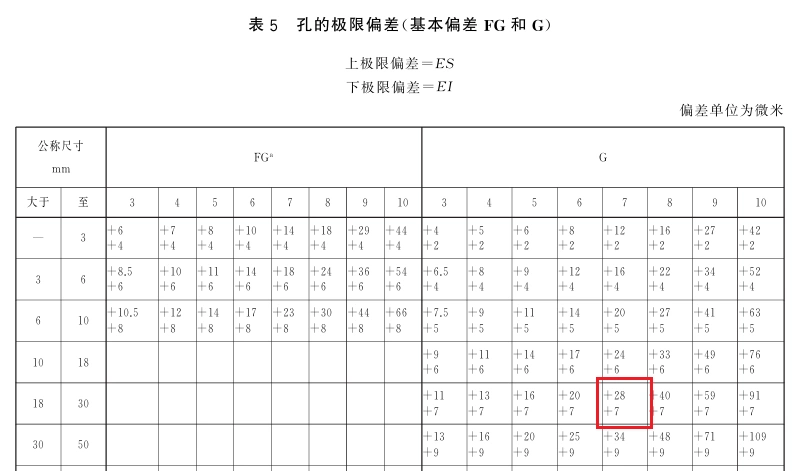 对于一个给定的公差带代号如Ø25G7 ,可通过查表(GB/T 1800.2-2020:孔的极限偏差表)获得其对应的极限公差数值:得Ø25G7 = Ø25(+0.007, +0.028),轴的公差带代号表示同理也可查表获得。