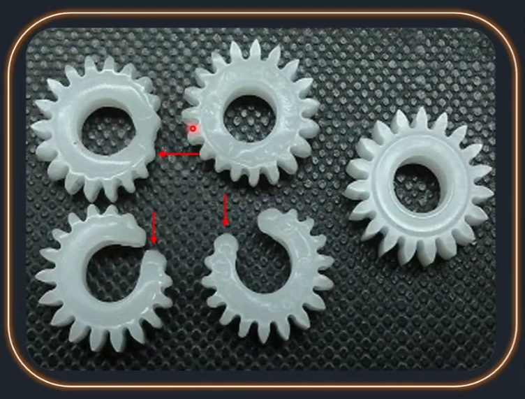 - 模具问题,水口设置不合理,胶件顶出不合理等;